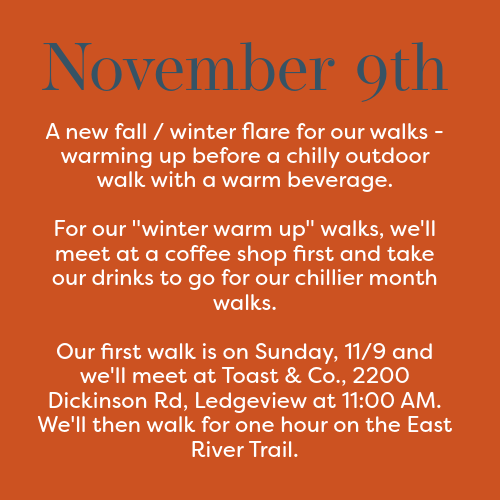 Sorry for the confusion on our part – we inadvertently posted two start times for the walk tomorrow. We will meet at 11:00 AM at Toast & Co. for our walk! Thank you!